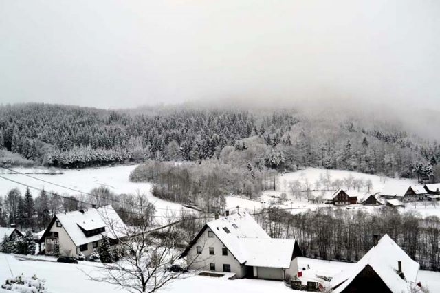Nuestra atenta funcionaria nos ha advertido que la ruta prevista iba a ser muy complicada con la intensa nevada pero nos ha sugerido que culmináramos la segunda parte de nuestra etapa hasta la pequeña Seebach para contemplar el Lago Mummelsee de origen glaciar. Pues bien de Seebach, como podéis ver en las imágenes lo que es ver no hemos podido ver nada y lo que es el lago y sus aguas lo hemos visto convertido en un gigantesco cubito de hielo.
