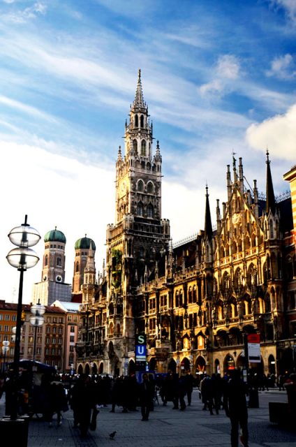 Marienplatz ó Plaza de María, es el centro neurálgico de Múnich, donde se encuentran el Ayuntamiento viejo, el nuevo y confluyen las principales arterias comerciales. Aparte de la espectacularidad de los edificios, a determinadas horas, el carillón del reloj del Ayuntamiento nuevo, ofrece un curioso desfile de figuras a tamaño natural que simulan una boda tradicional bávara concentrando en la plaza a numerosos curiosos.