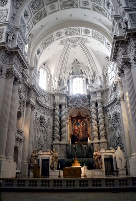 Después de almorzar en otra cervecería, claro está ya que la Hofbräuhaus hace del uso y abuso moneda de cambio habitual entre los ensimismados turistas, una vez finalizado el tour y por recomendación de Patricia nos dirigimos prestos a visitar la Iglesia de los Teatinos, conocida como la iglesia blanca y a juicio de muchos la más bonita de Múnich. Y es que en verdad resulta de lo más original, diferente a lo que estamos acostumbrados a ver en este tipo de edificaciones religiosas del SXVII ya que su interior se encuentra profusamente tupido de un barroco trabajado en estuco blanco, algo realmente raro de ver.