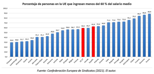 El actual gobierno de España se ha propuesto que, conforme a las recomendaciones de la U.E. el SMI alcance el 60 % del salario medio en 2023. Toda una rémora que hace que nuestro país se encuentre también por debajo de la media europea ya que nada menos que el 62 % de las personas que trabajan no alcanzan dicho porcentaje.
