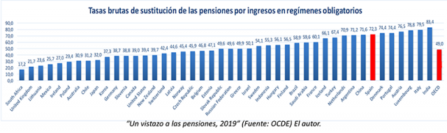 Cuando la cosa va más en serio se recurre a justificar semejante afirmación con que nuestro sistema de pensiones tiene una de las mayores «tasas de reemplazo» de la OCDE. ¿Qué quiere decir esto? Pongamos otro ejemplo al efecto. Si el último salario percibido por una persona antes de jubilarse era de 1.000 € y su pensión es de 800 €, la mencionada tasa será del 80 %.