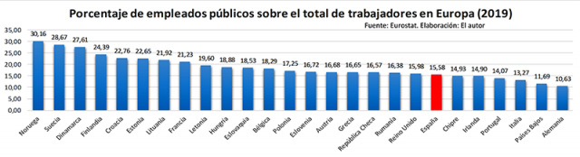 No en vano España no es ni de lejos el país con mayor número de trabajadores públicos. Más bien todo lo contrario lo que da una idea de la escasez de recursos que dedican las citadas administraciones a ello.